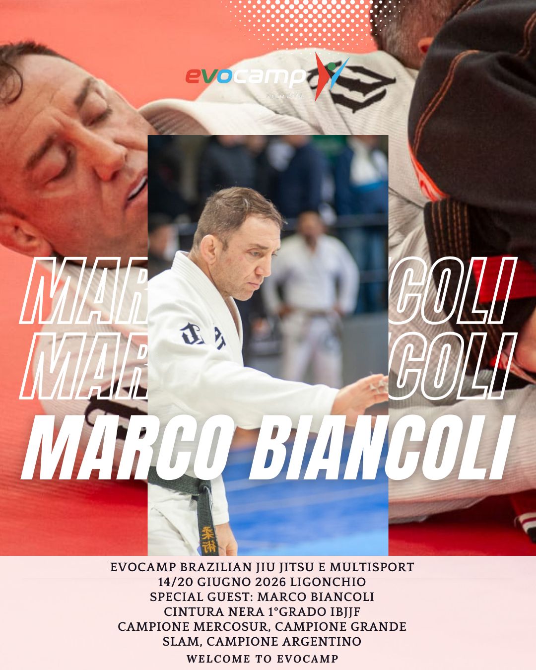 EvoCamp è onorato di ospitare il Prof. Marco Biancoli, cintura nera 1º grado IBJJF, atleta e coach di livello internazionale.